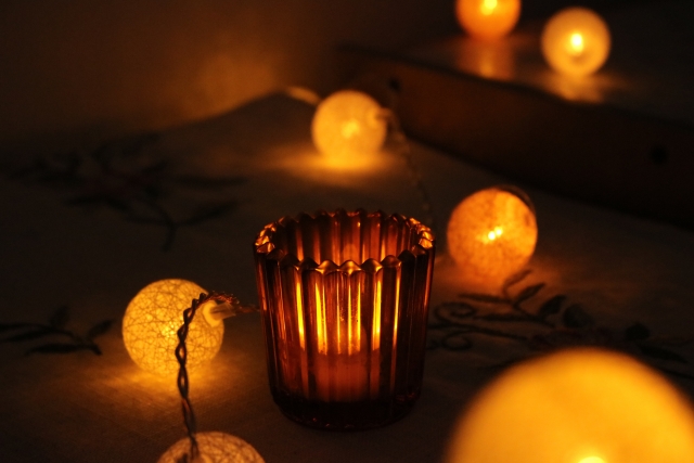 庭に飾る際には、本物のろうそくは危ないので、ろうそくのように揺らぐ明かりを灯すLEDのミニライトを、オレンジ色のガラスやプラスチックの透ける器に入れると雰囲気が出ます。