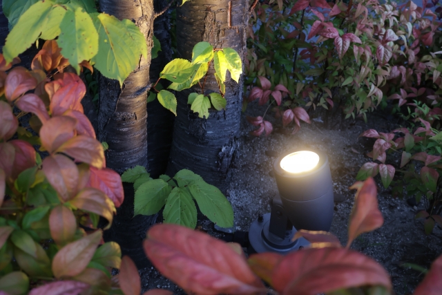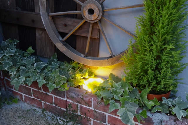 ソーラーライトや防水のガーデンライトを設置して、夜の庭をライトアップしてみましょう。