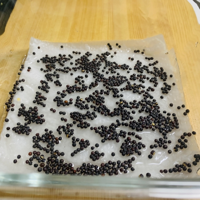 容器の底に合わせて折りたたんだキッチンペーパーを敷き、水に浸けた種子を重ならないように並べます。
